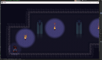 Parabéns pelo jogo criado! Os efeitos sonoros estão muito bons e o sistema de iluminação, diferente do padrão, deu uma pegada mais escura ao jogo, o que combinou bem com a proposta. O efeito na tocha ficou excelente, só seria bom ajustar o tamanho, pois às vezes parece que o fogo está saindo de fora dela.
